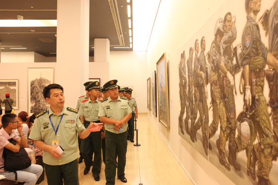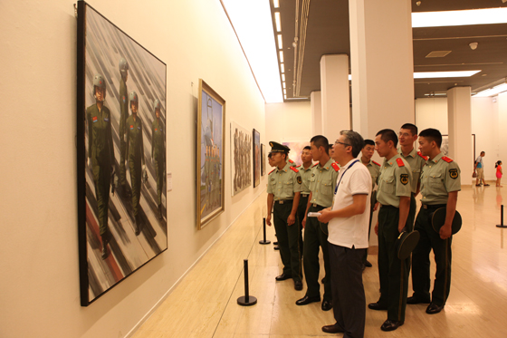 活动中,官兵们在策展人郭兴华、邢俊勤、王东方、宋时兵、于光明的引导下,饶有兴致地进行了欣赏和互动。这几位策展人也是部队美术工作者,深谙军事题材绘画创作,其讲解因此深入浅出,生动活泼。官兵们用心感受和理解每一幅作品的魅力,努力领会作品的题材内容和艺术手法语言。参展作品反映了我军光辉历史,讴歌了军民团结、军民鱼水情深的光荣传统,尤其反映出当前部队正在朝着“听党指挥、能打胜仗、作风优良”的建设目标不懈前进。展品的思想性、艺术性和时代性都很强,生动地展现了我军将士训练演习、执行复杂军事任务等场面,着力刻画了强军征程中涌现出的先进人物和高素质新型军事人才。这些,都让官兵们备感亲切、备受鼓舞,为广大官兵为实现“强军梦”的奋斗提供精神力量。官兵们在展厅中与策展人互动,畅谈“中国梦·强军梦”。很多战士表示,此次是他们第一次走进中国美术馆,第一次参观军事题材美术作品展览,感觉这样的教育形式很朴素,很新颖,也非常有意义。很多军事题材的作品反映的正是战士们的工作、生活状态,通过策展人的讲解,战士们对我军历史、当代部队生活有了更深的认识。