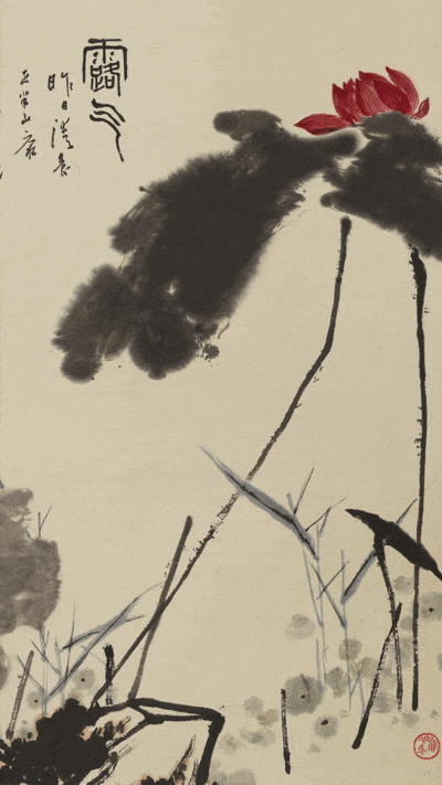 潘天寿(1897-1971) 原名天授,字大颐,号寿者。浙江宁海人。现代画家、教育家。他的画风气势磅礴,奇崛高古,“一味霸悍”之气撼人心弦。其用笔古拙劲健,常以书入画,多以隶书、魏碑方折觚线勾勒造形,如“屋漏痕”、“折钗股”,大起大落,收放自如。作于1958年的《露气》,是潘天寿与浙江美院师生下乡、参观早稻丰收后所创作。此画继承了吴昌硕写意花鸟画大气磅礴的风格,落墨凝练泼辣,并集众家之长,将中国画中点、线、面的表现形式发挥到极致。此画“从高处、远处、大处和最新奇处立意”,几片水墨淋漓的荷叶,恣意放纵,浓淡有致。莲茎用笔老辣遒劲,错落有致,穿插于荷叶间。半掩于荷叶之后的莲花,一收一放,着色古艳清雅。底边以浓重线条所绘的岩石,沉着痛快,将整个画面收住。虽未直接渲染露气,但以酣畅笔墨点出了露气弥漫的氛围,给人以慑人的张力和极简的结构美,同时洋溢着勃勃生机。此画“意写而工巧”,经得起深入推敲,真正做到“致广大,尽精微”。 潘天寿不仅在艺术创作上有突出成就,而且在美术教育方面也有着巨大的贡献,其将人生中的半个世纪都付诸于教学生涯与创作实践,他曾说过,“我这一辈子是个教书匠,画画只是副业”,可见其对自身定位以及对美术教育的重视。