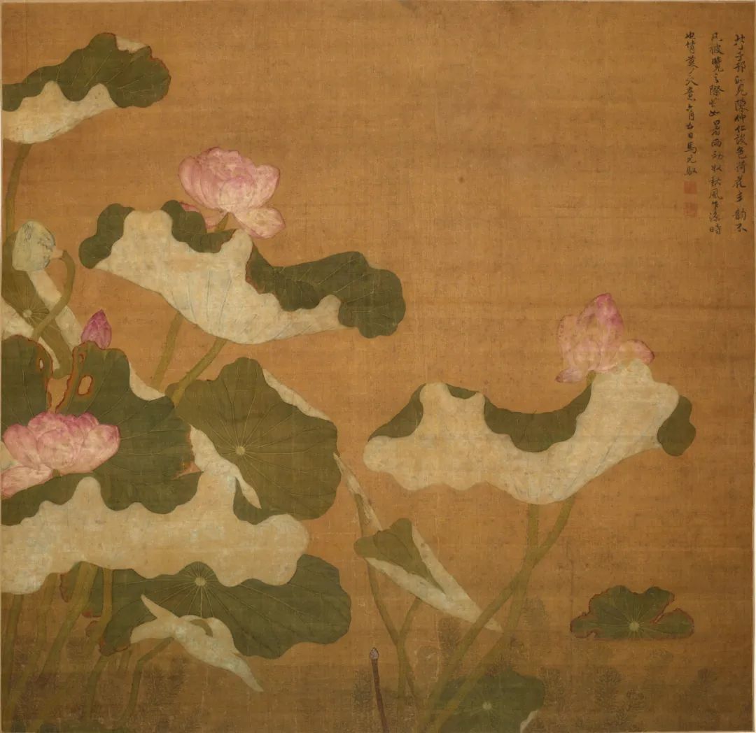 荷花,出淤泥而不染,中国古代绘画中常见的题材。清代画家马元驭所绘的这幅《荷花》收藏于中国美术馆,“设色荷花,丰韵不凡,披览之际,恍如暑雨初收,秋风乍凉时也”。画中荷花,粉白交错融合的花瓣,随风轻舞。荷叶舒展卷曲,如碧玉般晶莹剔透,与红荷相互辉映。马元驭喜爱在熟绢上作画,因绢质紧致细腻,使得着色效果尤为突显。这幅画作中,他巧妙地将没骨与工笔画法融为一体,色彩明丽,笔触俊逸,将荷花的美丽与清雅展现得淋漓尽致,使人仿佛能嗅到那荷花的芬芳,感受到盛夏中的清凉。