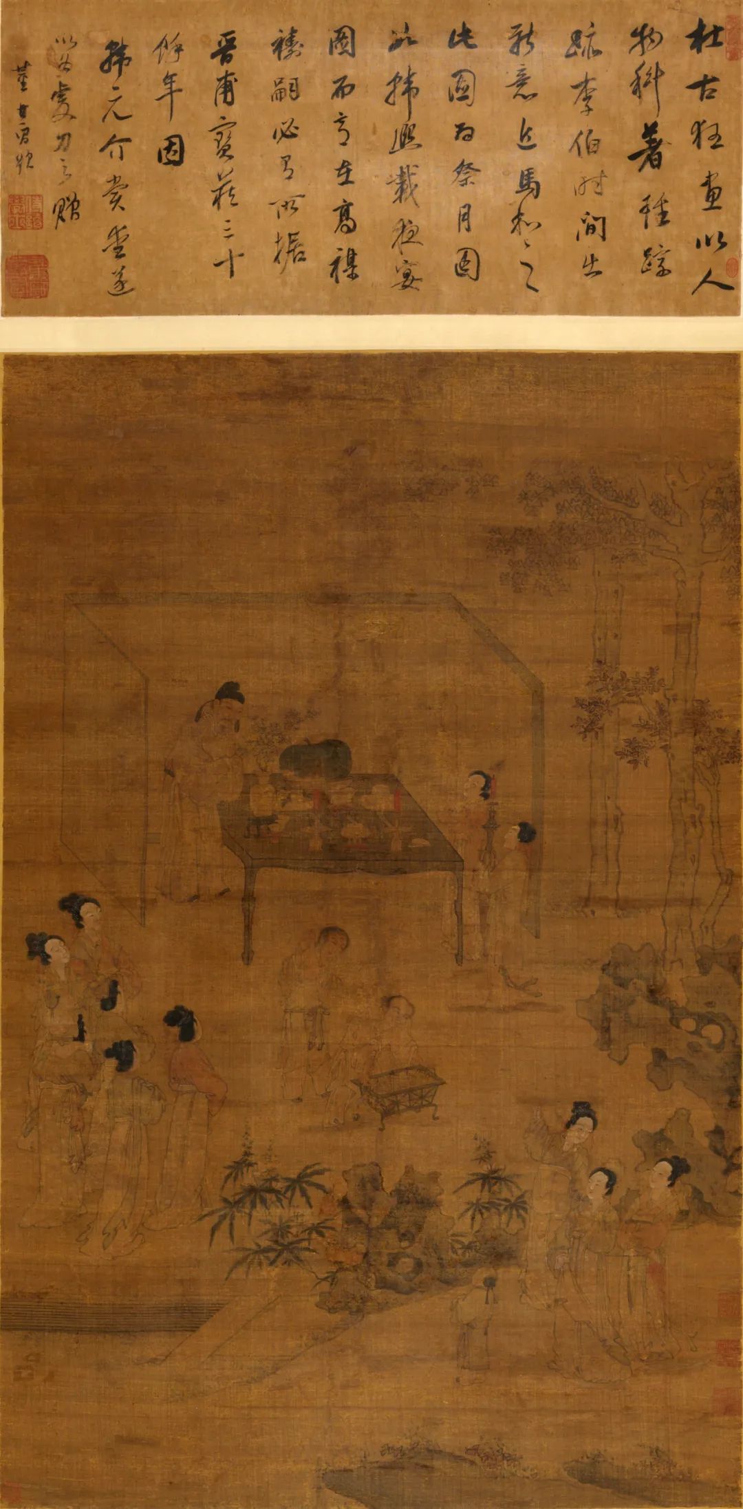 今天咱们要认识的是中国美术馆收藏的明代画家杜堇的《祭月图》,描绘了祭月仪式准备就绪的场景。月下庭院里,供桌静立园中,屏风环绕,桌上摆放着红烛、香炉、花瓶、瓜果点心等,寄寓祈福团圆。男主人正在桌旁忙着摆放供品,对面女主人在祈福,一旁的侍女则举着烛台。香炉前的两人也在忙碌准备,左中和右下的两组妇女儿童都期待地围绕在旁。十六个人物被巧妙分组,和谐地融入这祭月的场景之中。他们姿态各异,表情呼应,生动传神。文士插花、女子祷祝、童子赏月……内容丰富,布局疏密有致,人物工谨秀雅,线条细劲而流畅,设色清淡而雅致。