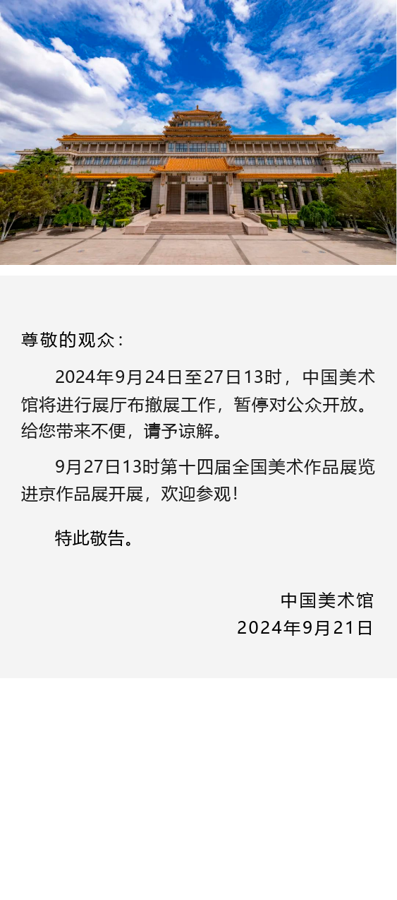 中国美术馆9月24日至27日13时因布撤展暂停开放