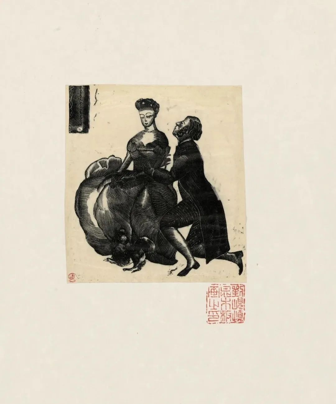 赫列斯塔科夫拦住她的去路:“出于爱情。我是真正出于爱情,您别生气,我愿意跪在您面前请求您的宽恕。”说着真的跪了下去。