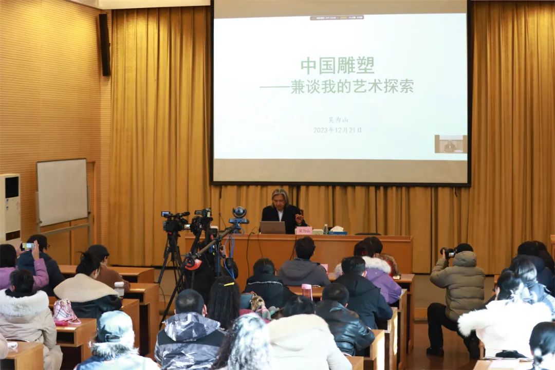 2023年12月21日,全国政协副秘书长、民盟中央副主席、中国美术馆馆长吴为山受邀来到中国国家画院,以“中国雕塑——兼谈我的艺术探索”为主题上了一堂生动的公共课。参加本次公共课的有中国国家画院党委书记燕东升、中国国家画院副院长徐涟,中国国家画院教学培训部主任邱雷及部门全体职工,以及中国美术馆部分青年职工代表等。中国国家画院2023年访问学者、高研班和2023年文化和旅游部全国画院中青年创作骨干研修班的学员通过现场和线上直播的方式聆听课程。本次公共课由燕东升主持。